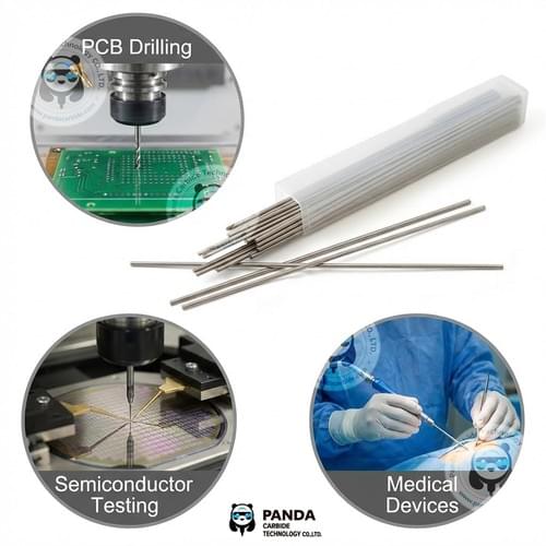 High-precision tungsten carbide needle rods (dia. 0.2mm+) for semiconductor testing, PCB micro-drilling, and medical probes. HIP-sintered for zero porosity. Get factory-direct quotes from Panda Carbide.